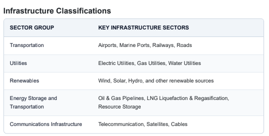 Infrastructure can be classified in the following sector groups and 11 key infrastructure sectors detailed in the graphic below: