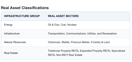 Global listed real assets can be separated into four infrastructure groups — energy, infrastructure, natural resources, and real estate — and the following real asset sectors detailed in the graphic below: