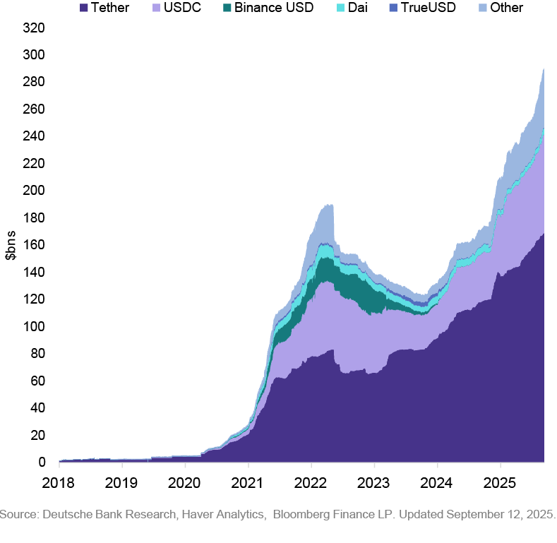 As seen in the chart below, the market capitalization for stablecoin surged from $5 billion in 2020 to $290 billion in September 2025, with initial estimates projecting a rise to $310 billion at the end of the year.