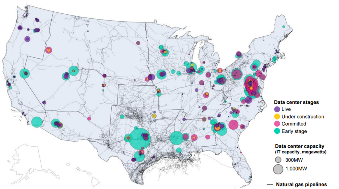 To execute this, operators are leaning heavily on natural gas turbines, which can be built and fueled with direct pipelines much faster than waiting for grid upgrades. Specifically, natural gas infrastructure can be deployed in just 2-4 years, aligning well with aggressive data center construction timelines. Furthermore, most planned data center capacity is already clustered near existing natural gas networks, particularly in Texas as shown below.