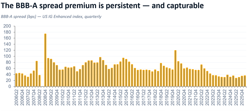 The goal is simple: capture higher income through disciplined “relative value” positioning. Specifically, the strategy is designed to lean into yield when the market is paying you to take credit risk (when BBB-A spreads are wide), and scale back in tighter regimes. By using predictable, rules-based controls, the index stays disciplined across the full credit cycle, remaining largely market-agnostic.